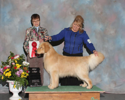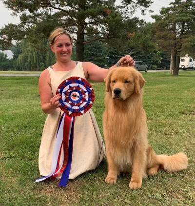 Cayde is co-owned with Gwen Taylor and myself. What can we say about Cayde other than he has exceeded our expectations! He quickly finished his championship as a puppy and continued to excel in the specials ring. He then headed south of the border and finished both his American Championship and Grand Championship in very limited showing. In 2023 Cayde hit the campaign trail and finished the year as #1 Golden Breed Points, #2 Golden overall and #10 All Breed! Along the way he won multiple Best in Shows, Reserve Best In Shows and Specialty wins, his SDHF, VC and GCh Ex along the way. Not just a pretty face, Cayde also entered the performance ring and earned his CD, RN and is working on adding more titles. Thank you Gwen for giving Cayde the opportunity to excel!